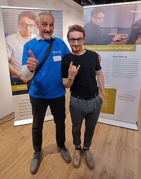 Die Ausstellung wandert mit ihren insgesamt 13 Roll-Ups an verschiedene Orte. Ein Roll-Up erzählt u.a. die Geschichte von Daniil Shvedov, der Paritätische Jugendmigrationsdienst half ihm auf der Suche nach einem Ausbildungsplatz (siehe Foto). Unterstützung erhielt Daniil auch durch das preisgekrönte Patenschaftsprojekt SymPat.